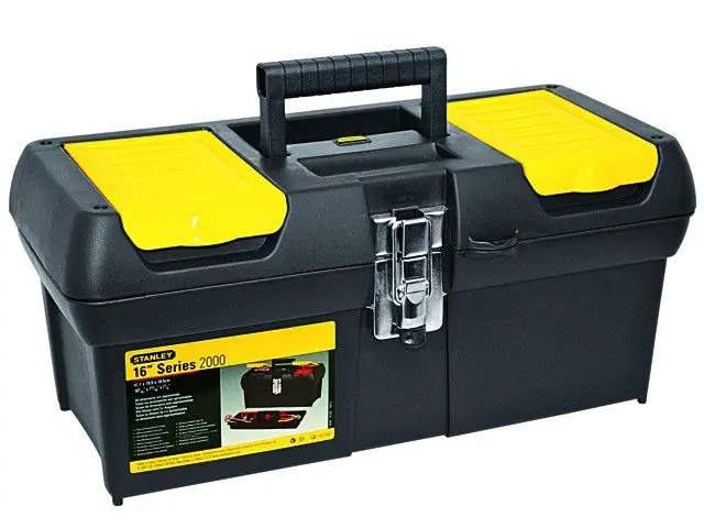 Caixa de ferramentas de 16” feita de polipropileno, com seis peças, bandeja interna organizadora e fecho com travas em metal niquelado. Tudo com a qualidade Stanley.
