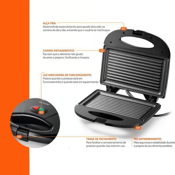 Lanches mais gostosos e sem grudar. A sanduicheira multilaser minigrill gourmet 220v é antiaderente e permite a preparação dos alimentos sem fazer com que ele grude em sua superfície. O preparo ainda pode ser feito sem óleo, resultando em mais saúde e leveza para suas refeições. Disponível em 220v. imagens meramente ilustrativas